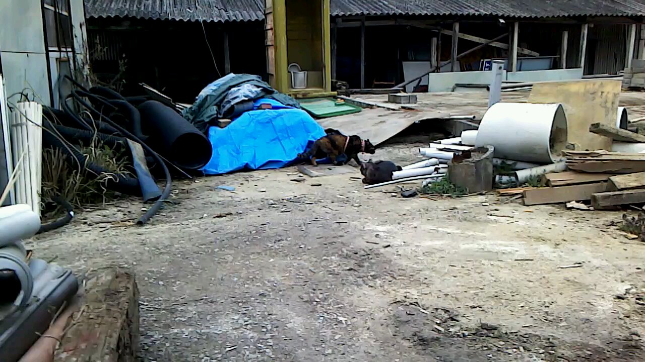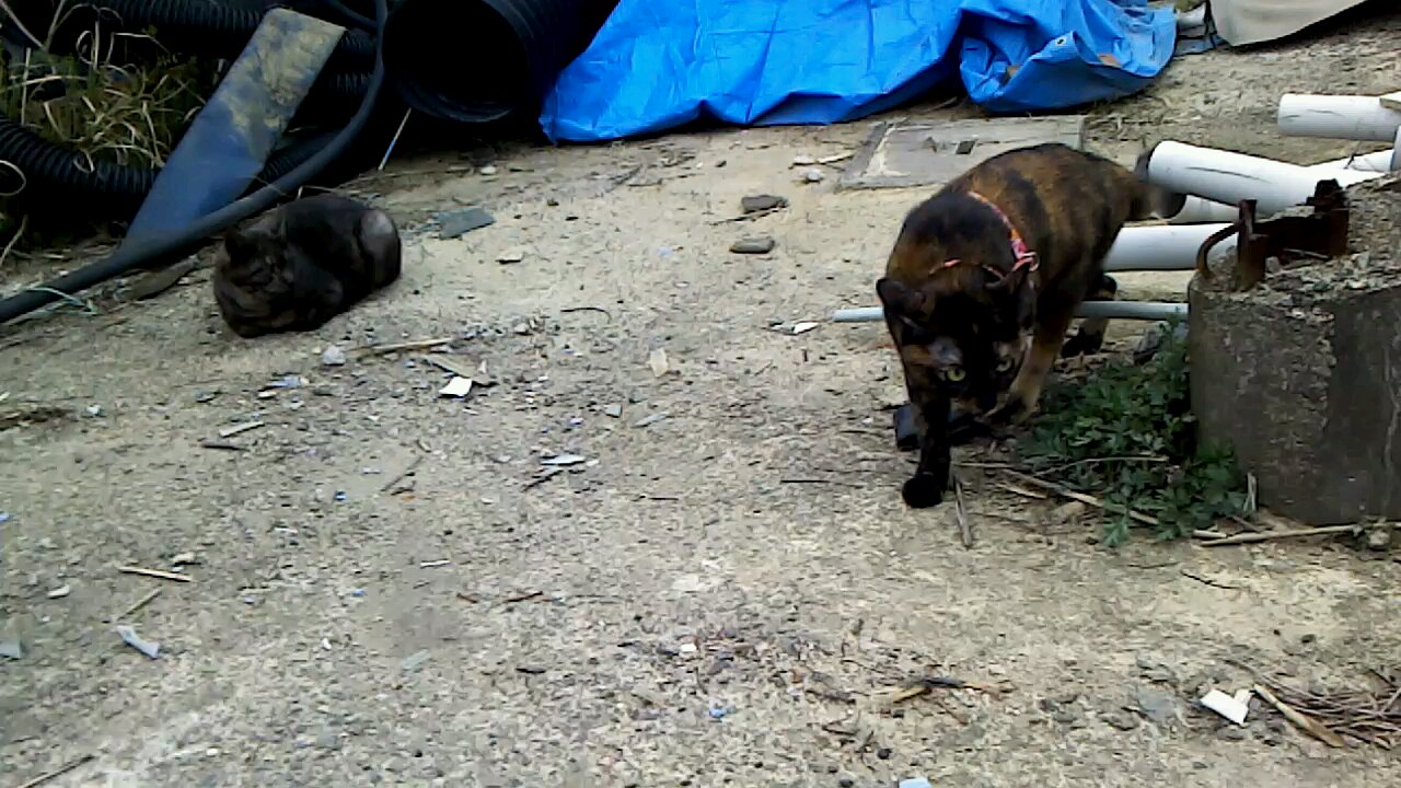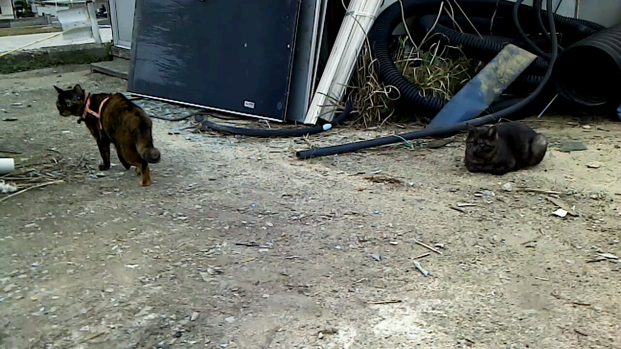 近所の飼い猫のちびちゃん達と対決にゃあ